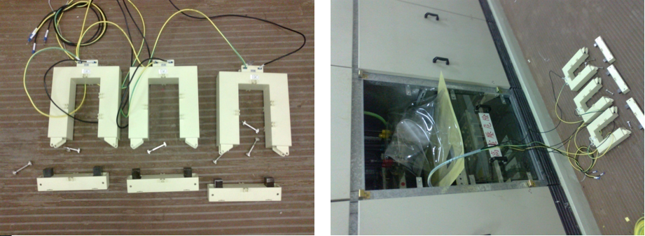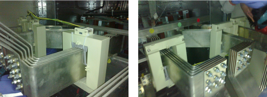 停電后將所有回路的開(kāi)口電流互感器,全部同時(shí)安裝在母排上,并將開(kāi)口電流互感器上、下兩部分通過(guò)螺絲、螺母安裝好,如下圖所示:
